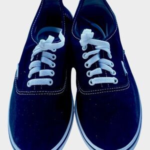 Casual low-top Vans in black canvas. White laces and white midsole trim. Simple, versatile skate-style shoe. Clean lines and classic Vans silhouette.