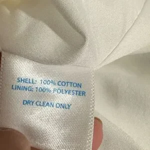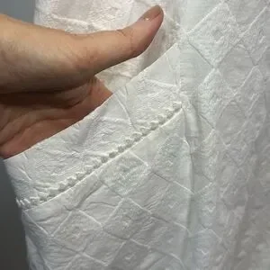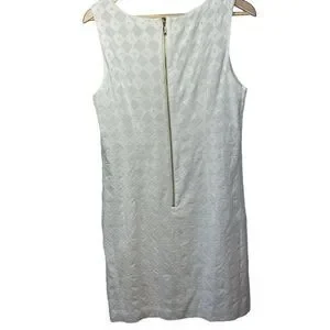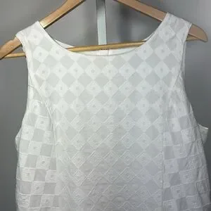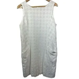 Bateau neckline. Sleeveless. Two front patch pockets. Gold-tone exposed back zipper closure. Lined. White with textured diamond print. 100% cotton. No stretch. Resort wear. Snowbird. Country club. Preppy. Cruise. Travel. Classic. Timeless. Lightweight.