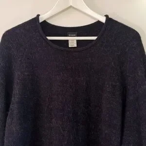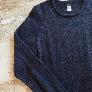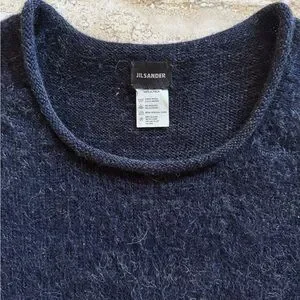 Beautiful 100% alpaca knit crewneck sweater by Jil Sander. Mid weight, high quality knit with rolled collar and hems. Straight cut shape with slightly elongated silhouette. Men’s style but easy to style unisex.