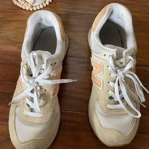 Classic New Balance sneakers in cream with peach accents. Suede and mesh upper for flexible wear. Padded collar and cushioned midsole for comfort. Lace-up closure for a secure fit. Neutral palette that pairs easily with outfits. This listing is for a pair of new balance 574. They are women’s size 8. These shoes feature beautiful shades of cream, taupe, light peach and gold. These shoes have been well cared for, but there are a few signs of wear so please see pictures as they are part of the description.They are comfortable and the colors pair really well together. Non-smoking home. Thanks for looking!