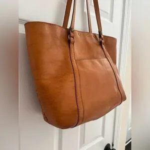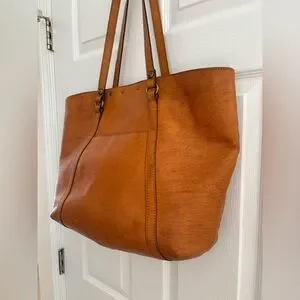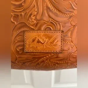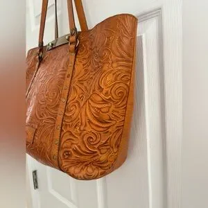 Excellent condition Patricia Nash large leather tote/shoulder bag in cognac/tan. Floral embroidered, paisley design on leather with gold hardware.