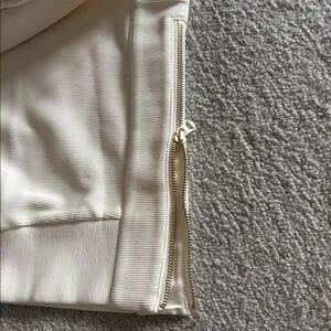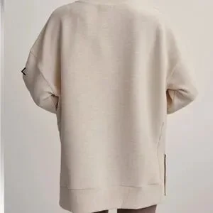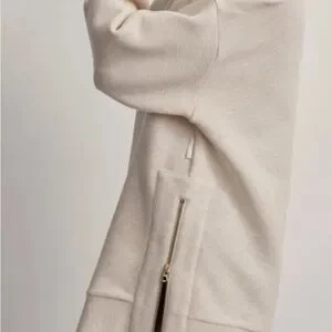 Ribbed fabric in cream. Heavy duty side zips at the hem on both sides. Banded crew neck, hem and cuffs.