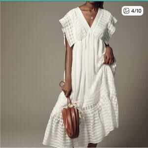 Midi white V-neck dress in a really soft pretty fabric. Wore a handful of times. A little over sized. Recently dry cleaned. Really cute with cowgirl boots or sandals.