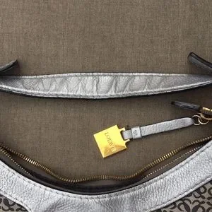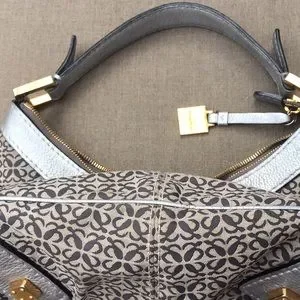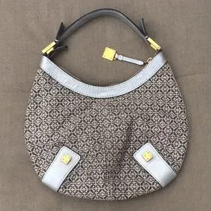 Loewe, Anagram Jacard collection shows their signature monogram in the jacard fabric of the bag. Founded in Spain in 1846, Loewe has an obsessive focus on and a commitment to craftsmanship. It measures approximately 16" at the widest & 13' at the tallest point with a 7” handle drop. Please see images for as-is condition. Shoulder bag has been lightly cleaned & had some refurbishment. Ships from smoke/pet free home.