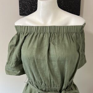 FRAME DENIM Linen Off the Shoulder Dress Olive Green Tie Waist Sz XS