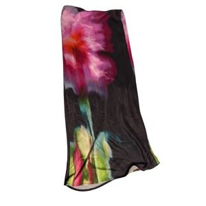 Anthropologie midi skirt showcases a stunning large-scale blurred floral print in vibrant shades of pink, orange, and green against a dark charcoal background. Crafted from a soft, lightweight 100% viscose fabric, this piece offers a smooth drape and comfortable wear. The pull-on design features a thin elastic waistband for a clean, streamlined look that transitions easily from day to evening.