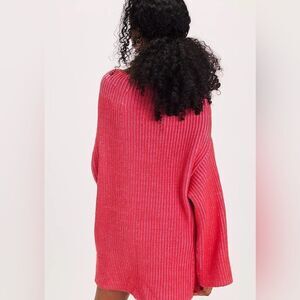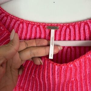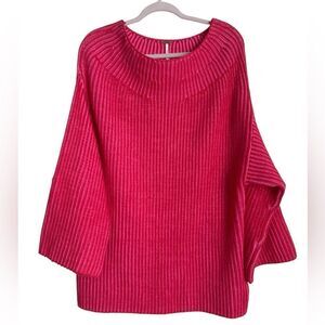 Bright pink sweater with ribbed texture. Features contrasting cuffs. Ideal for casual wear. Armpit to armpit, 21 inches. Top to hem, 29 inches