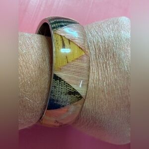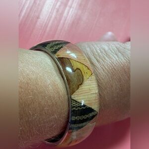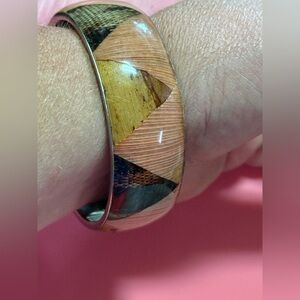 Stylish wooden bangle with geometric patterns. Features natural wood tones and black accents.