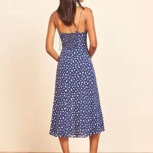 Reformation Blue Polka Dot Viscose Midi Dress Size 14 Bustier Slit
