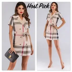 Chic mini dress with a plaid pattern. Features a double-breasted design. Includes a stylish belt. Perfect for any occasion.
