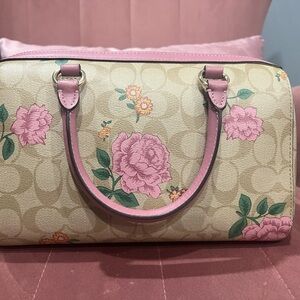 Elegant Coach satchel with pink floral design. Beige base complements the pattern. Perfect for any occasion.