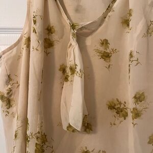 This sleeveless blouse from Coldwater Creek features a relaxed fit with a charming tie front detail. The cream base is beautifully complemented by a subtle green floral pattern, offering a touch of elegance and casual sophistication.