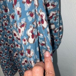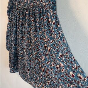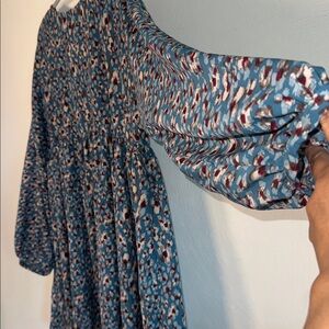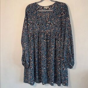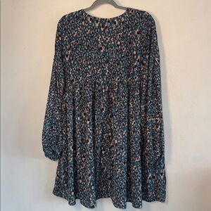 Chic teal dress with a striking pattern. Features long sleeves and a flowing silhouette. Loose fit. Perfect condition.