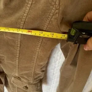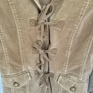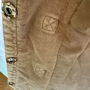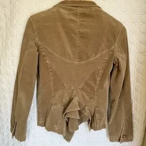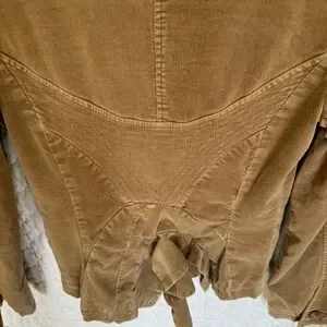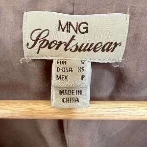 The MNG Mango brown velvet-like jacket in size small is a stylish and versatile piece for women. This short jacket features a solid brown color with a lining made of crushed velvet, giving it a luxurious feel. With accents like snap buttons with tie closures and two front pockets, this jacket is perfect for casual occasions during all seasons. The jacket has a collared neckline and ruffle detail on the back, adding a touch of designer flair to the basic jacket style. Made in Spain by Mango, this jacket offers a regular fit and is a must-have for any fashion-forward woman's wardrobe.
