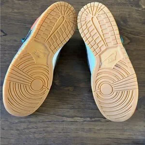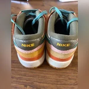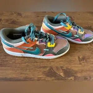 Fun and bold Nike dink low sneakers. Features green, purple, and yellow accents. Comfortable and durable. Great used condition.