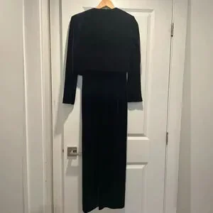 In very good, clean condition. Stunning navy velvet velour gown with slit in back at the bottom. Matching belero style cardigan with stunning accent details.