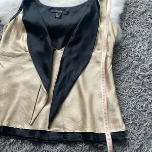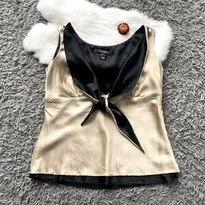 The blouse features a sophisticated design, perfect for both professional settings and chic casual wear. Its unique tie-front detail adds a modern and stylish flair, allowing for versatile styling. The combination of black and a warm, champagne/gold tone creates a striking contrast that is both classic and contemporary.