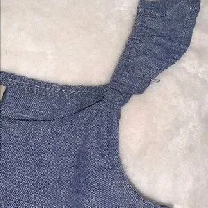 Cute, denim-look/chambray top with hi-low hem & floral embroidery. Has ruffle shoulder straps. In excellent, clean condition!