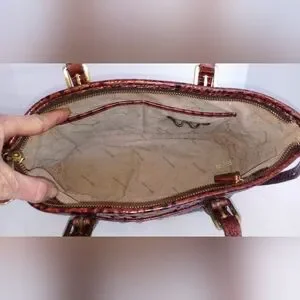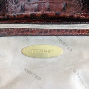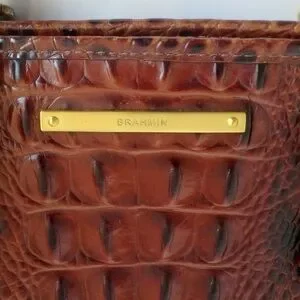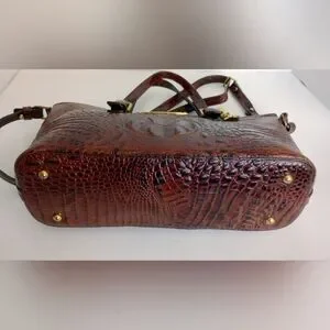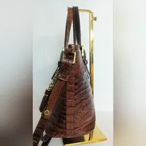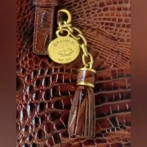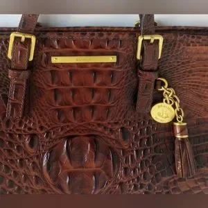 Brahmin Mini Asher crocodile embossed convertible leather crossbody satchel purse, shoulder bag, in Pecan Melbourne, brown and black, with medallion charm and tassels. Double handles and adjustable removable crossbody strap. Outer rear slip pocket, Gold hardware, zip top closure, four bottom studs. Brahmin signature chamois lining with interior zip pocket, two slip pockets, two pen holders, and key clip. Medium size bag, measures approximately 11.5" wide across bottom, 13" wide across top, 7.5' high, 4.5" deep. Gently used, in very good condition. Ships same or next day.