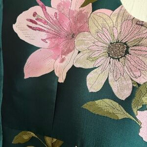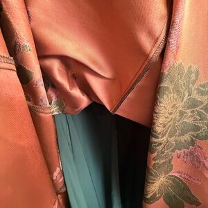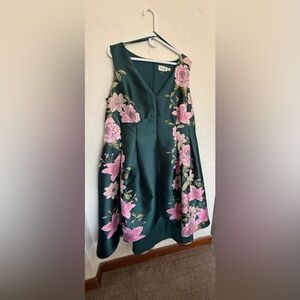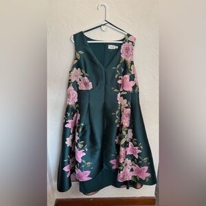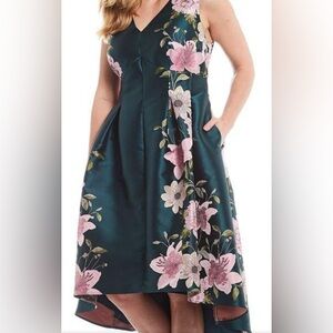 Elegant high low dress by Eliza J. Features a green base with pink floral design. Perfect for special occasions.