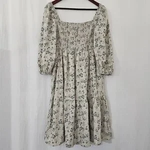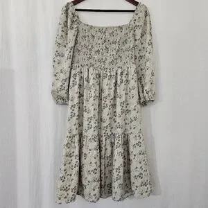 Orange Creek Long Sleeve Square Neck Ruched Midi Dress in Cream & Blue Floral