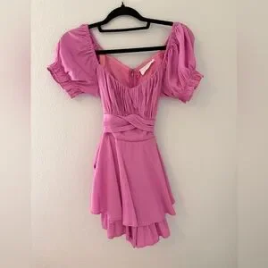 Chic pink dress with puff sleeves and a fitted waist. Perfect for any occasion. very soft and comfortable fabric.