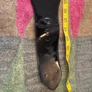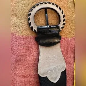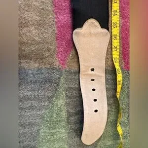 Belt is very stretchy. Used but still looks good on and is a handy belt for many dresses