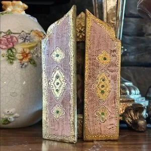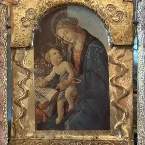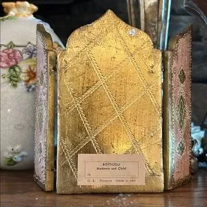 Elegant vintage gold and pink Florentine triptych features a print of Botticelli’s iconic Madonna and Child. Made in Italy.