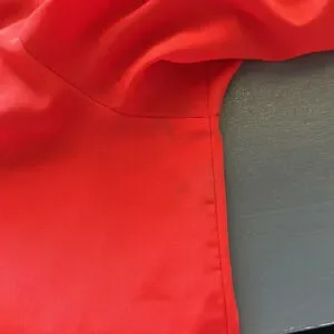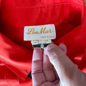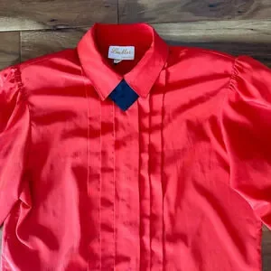 Super fun silky red material with sewn in shoulder pads and a black collar piece for a great 70’s/80’s vibe