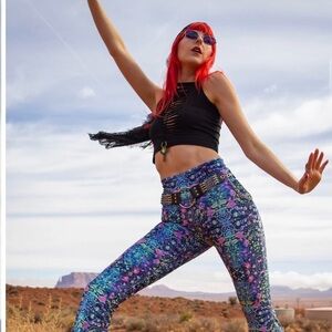 Vibrant leggings featuring a multicolor pattern. Includes a stylish chain detail. Worn two times! In great condition and ready for your next adventure!