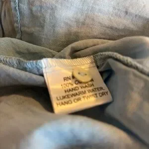 JP and Mattie Sundance lightweight button down blouse in a sunwashed blue chambray cotton. Banded collar with a tiny ruffle, smocked pleated detail on the chest. Fabric is soft and breathable in a light faded wash blue with a relaxed fit.