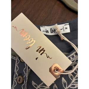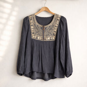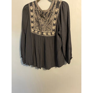 In bloom blue long sleeve shirt with cream embroidery around the neck and shoulders. The shirt is fully lined. NWT Size Medium