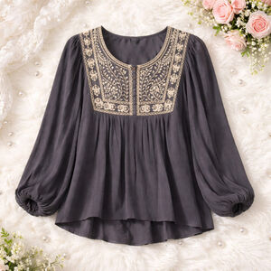 0124 NWT in bloom blue shirt with embroidery around the neck and shoulders.