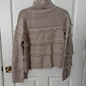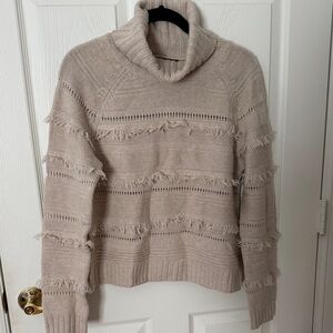 Stay warm and stylish with this cozy beige turtleneck sweater. Brown Allan size medium. Fringe Detail. Mix of merino wool and cashmere. Perfect condition. Smoke-free home.