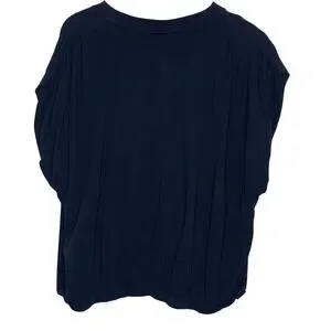 Soft jersey knit top features a relaxed, draped silhouette with a unique banded bubble hem for a flattering blouson effect. Designed with a classic crew neckline and dolman-style short sleeves, this versatile pi offers a comfortable yet elevated look for everyday wear. The black hue and subtle pleating details at the shoulders add a touch of sophisticated texture to this effortless staple.