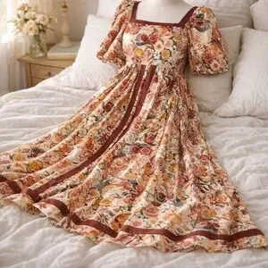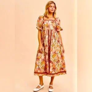 Romantic floral midi dress featuring a flattering square neckline, soft puff sleeves, and an empire waist silhouette. The flowy skirt drapes beautifully, making this an easy, comfortable, and feminine piece. Perfect for brunch, garden parties, weddings, or everyday romantic wear.