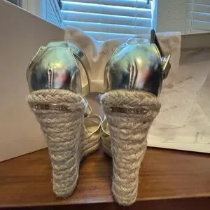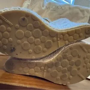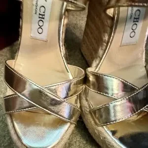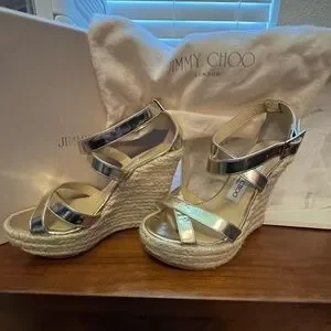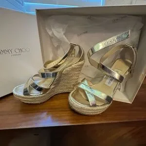 Elevate your style with these stunning Jimmy Choo gold Porto Platinum espradrilles wedge sandals. Perfect for any occasion, these shoes offer both elegance and comfort. Worn once. These are from my own collection. I just don’t wear heels anymore. Sad to let them sit in my closet. They are made to have fun! Size 36EU/6 smoke free home.