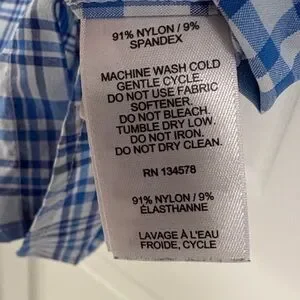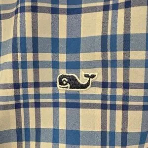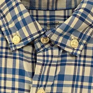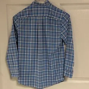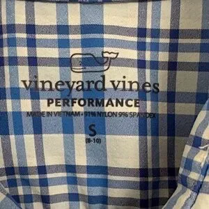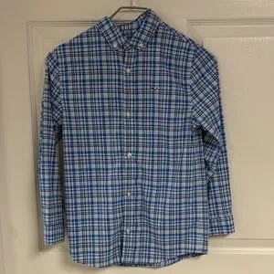 Boys 8/10 Vineyard Vines button down shirt in blue and white plaid. Performance shirt that is polyester and spandex is quick drying and moisture wicking. Cool shirt on a hot day! Non smoking home.
