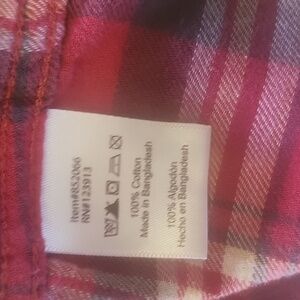 Jacks Girlfriend Red/Blue Plaid Pearl Snap Light Flannel Top Size L- See pics for measurements, 100% Cotton, Faded Comfy Look, Paisley Along Neck & Wrists Inside, Pearl Snap Front Closure & at Cuffs, Tie at waist for casual country look, rodeo ranch ready, Excellent Pre-Loved Condition, Dog Friendly Home.