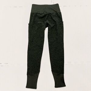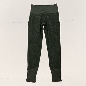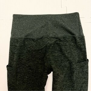 Kirkland Signature brushed leggings in a dark green heathered fabric. Features a wide comfortable waistband, side pockets, and ribbed ankle cuffs. Soft stretch fabric makes them great for workouts, yoga, or everyday athleisure wear.