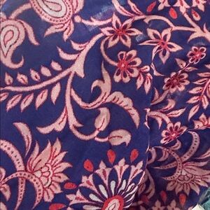 Vibrant kimono cardigan with floral and geometric patterns. Features a mix of blue, pink, orange, and black colors. Perfect for layering. Worn 1 time. Like new
