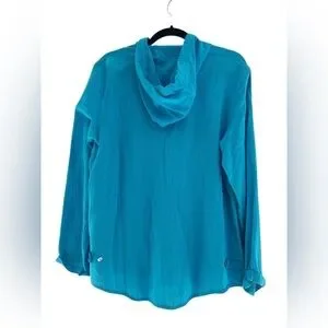 Vibrant turquoise hoodie with zip closure. Ideal for casual wear.