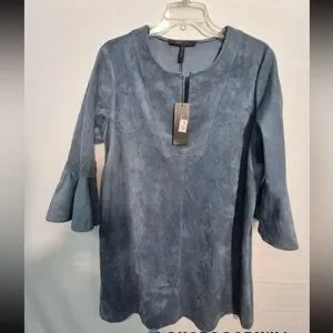 Stylish suede like steel blue dress with witchy 3/4 bell sleeves from BCBGMaxAzria. Ideal for versatile wear.