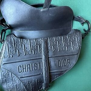 Chic Dior saddle bag with embossed logo. Elegant black leather. Perfect for any occasion.