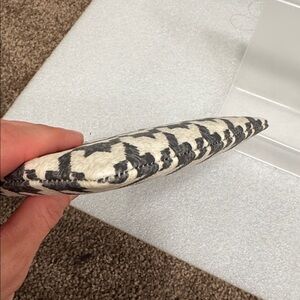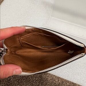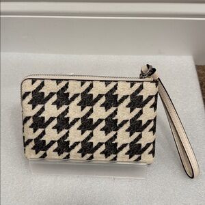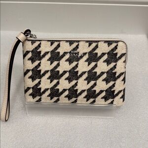 This is a coach black and cream corner zip houndstooth pattern wristlet wallet. It is new with tags although they aren’t attached anymore and they have 2 card slots inside. It measures 6.5” x 4”.