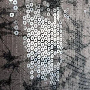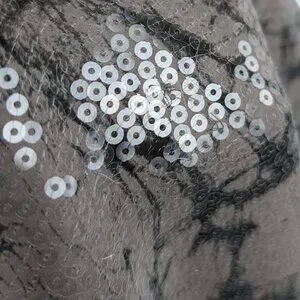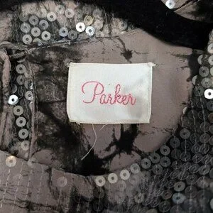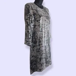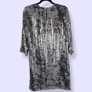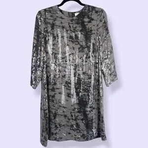 This dress by Parker is made of 100% silk and is covered in clear sequins from top to bottom. The dress has 3/4 length sleeves, a round neckline, a single button at the back of the neck, a full lining, and an abstract pattern in black and taupe. The fit is slightly looser and falls around or just above the knee. Despite being covered in sequins, the dress doesn't feel overly heavy and the silk has nice movement. The dress has normal wear, and only one small issue. On the back towards the bottom there is a small area with what looks like 2 or 3 loose threads and maybe a couple sequins missing (see last pic). It's not very noticeable at all given the height and the dress's overall sheen, but it is present. I have also since snipped the extra threads around the tag, which were probably the "worst" sign of wear.