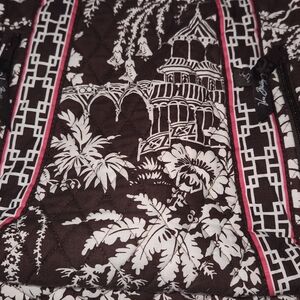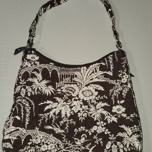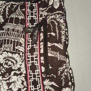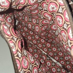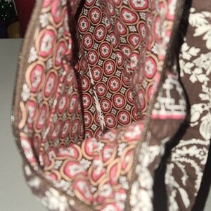 Stylish Vera Bradley quilted bag in brown and white. Features a unique pattern with pink accents.
