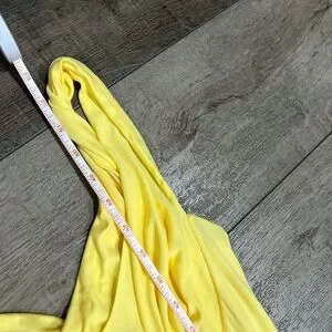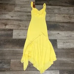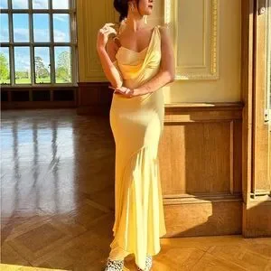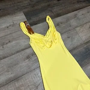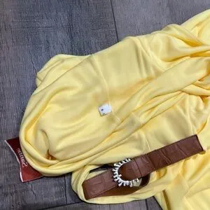 Introducing our baby yellow asymmetrical dress, a stunning blend of style and comfort designed for the modern woman. Crafted from lightweight stretch viscose, this dress exudes elegance and breathability, making it ideal for warmer seasons. Embrace effortless movement with its asymmetrical fluid hem, allowing the fabric to flow gracefully with every step you take. The slim fit silhouette flatters and hugs your figure, while the drape over the bust adds a touch of sophistication to the design. Accentuating the shoulders, a tan croc leather strap with a sleek silver buckle provides a chic and unforgettable detail. Perfect for both spring and summer, this dress offers a versatile and timeless addition to your wardrobe, ensuring you look and feel your best on any occasion.