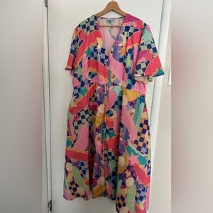 Midi length button up vibrant dress from Australian company Little Party Dress. Linen, with pockets and a drawstring waist tie for a custom fit.