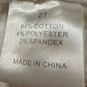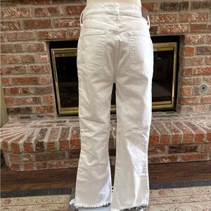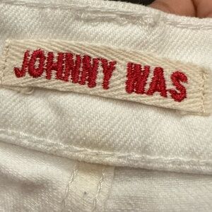 Stylish white Johnny Was flare jeans. Features colorful embroidered side trim. Frayed hem adds flair. ๐